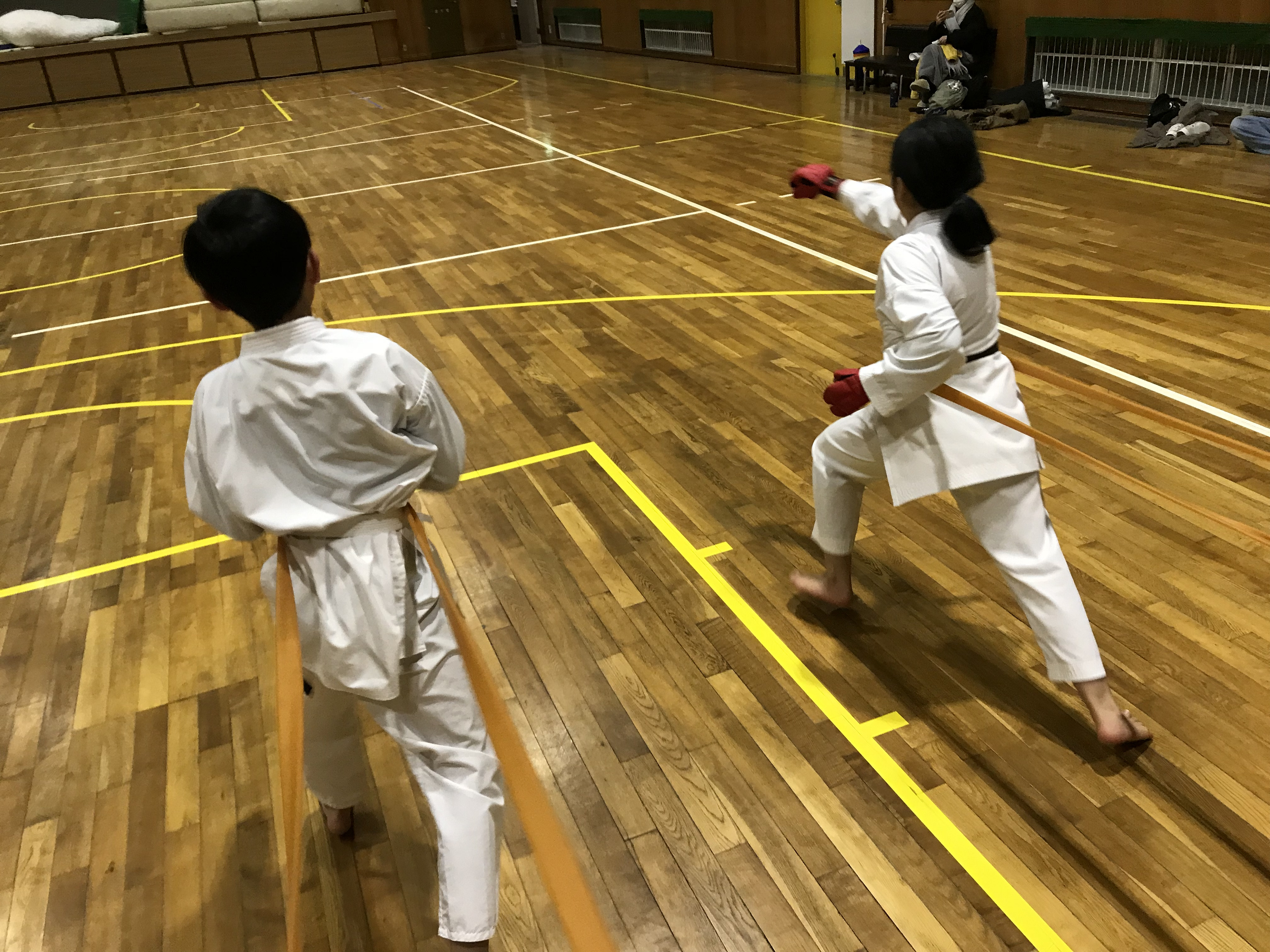 これも筋力が無いので深く沈むことが出来ませんが、茶帯生に深く沈んだカッコ良い中段突きのお手本を見せてもらいました。