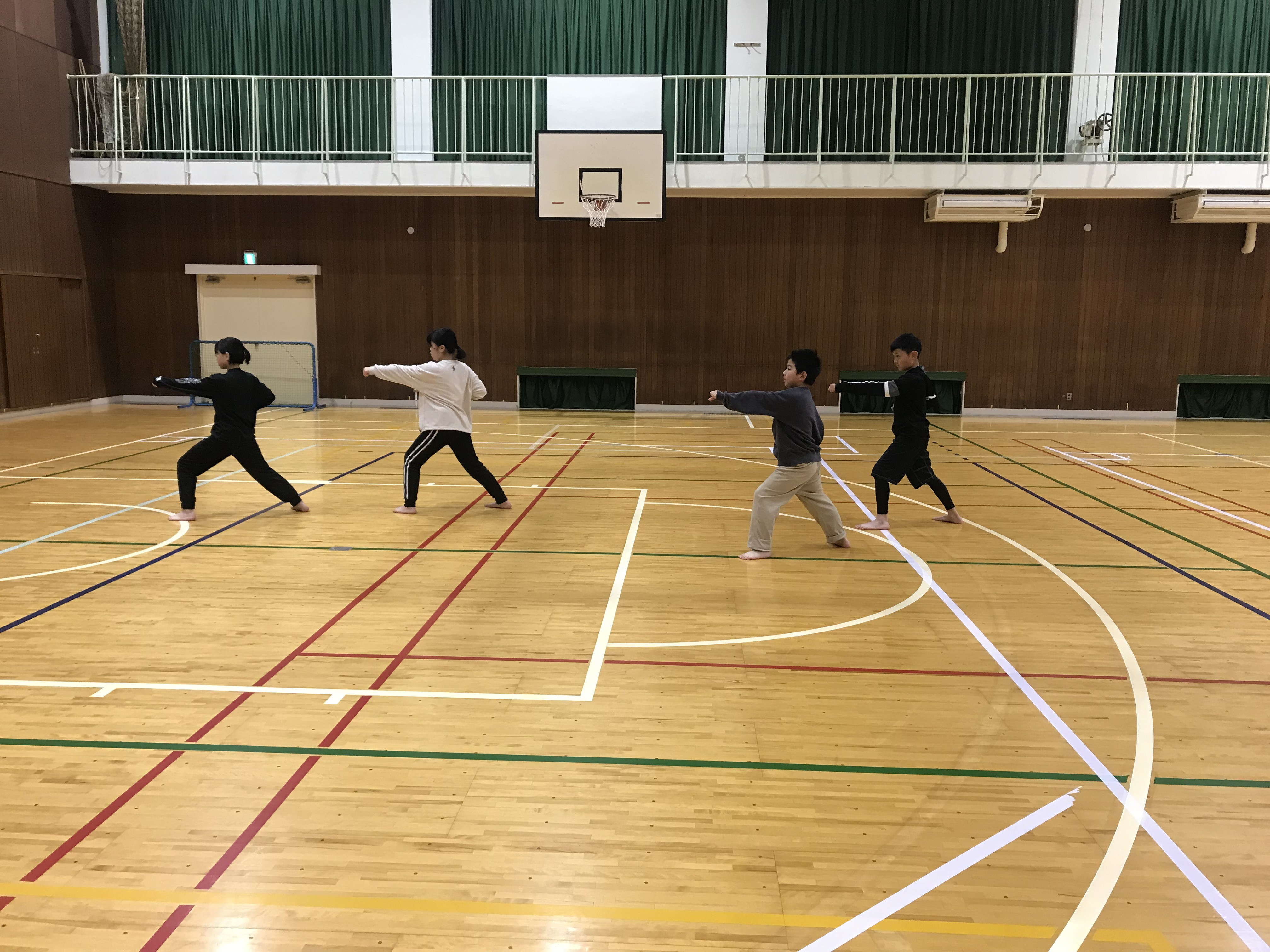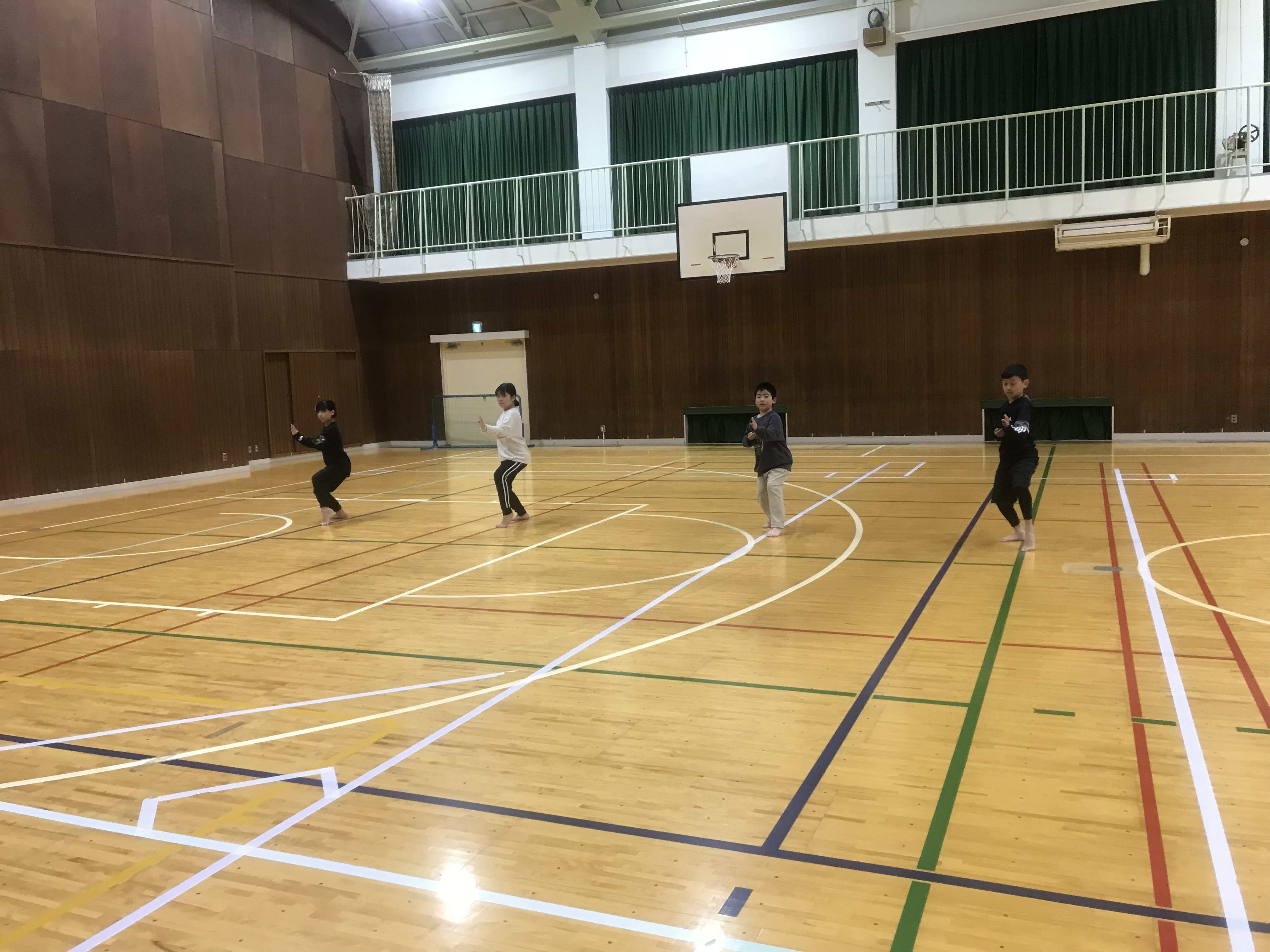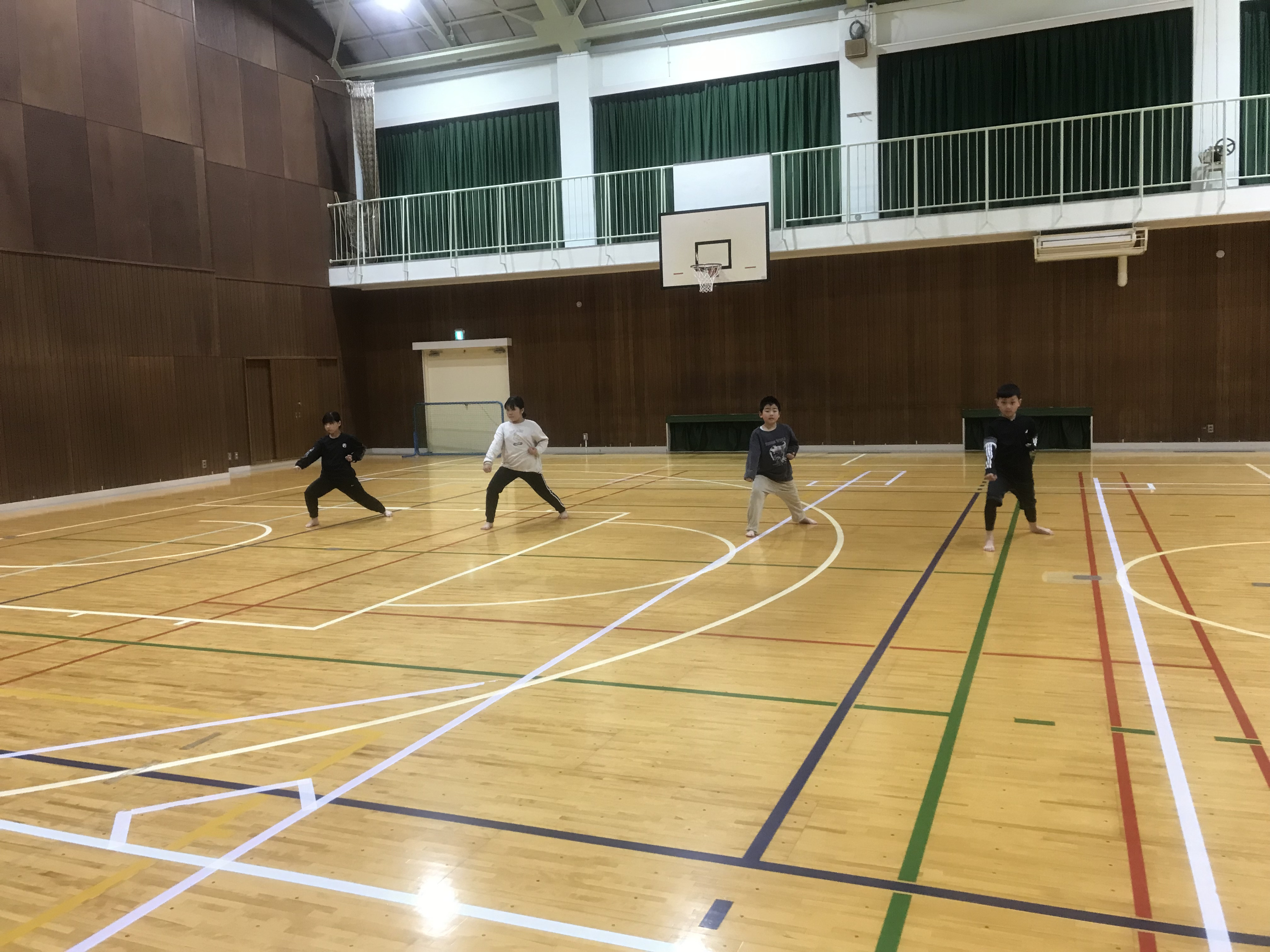 体育館にはラインテープが有りますので、その線を上手く活用して稽古を行いました。